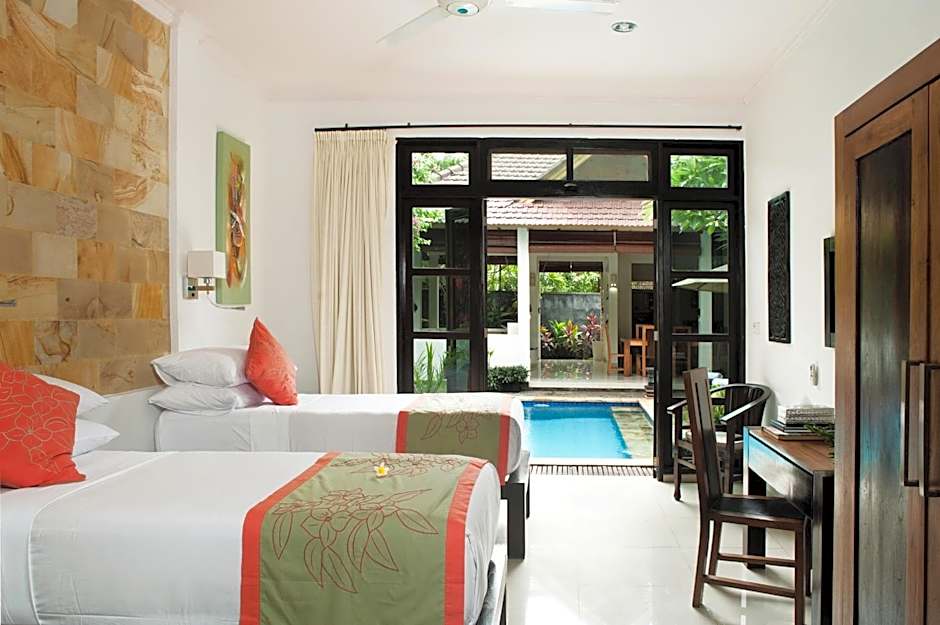This elegant two-bedroom villa features a private outdoor swimming pool, a separate living area, dining area, and a large well-equipped kitchen. Each bedroom is air-conditioned and the private bathrooms have shower facility.